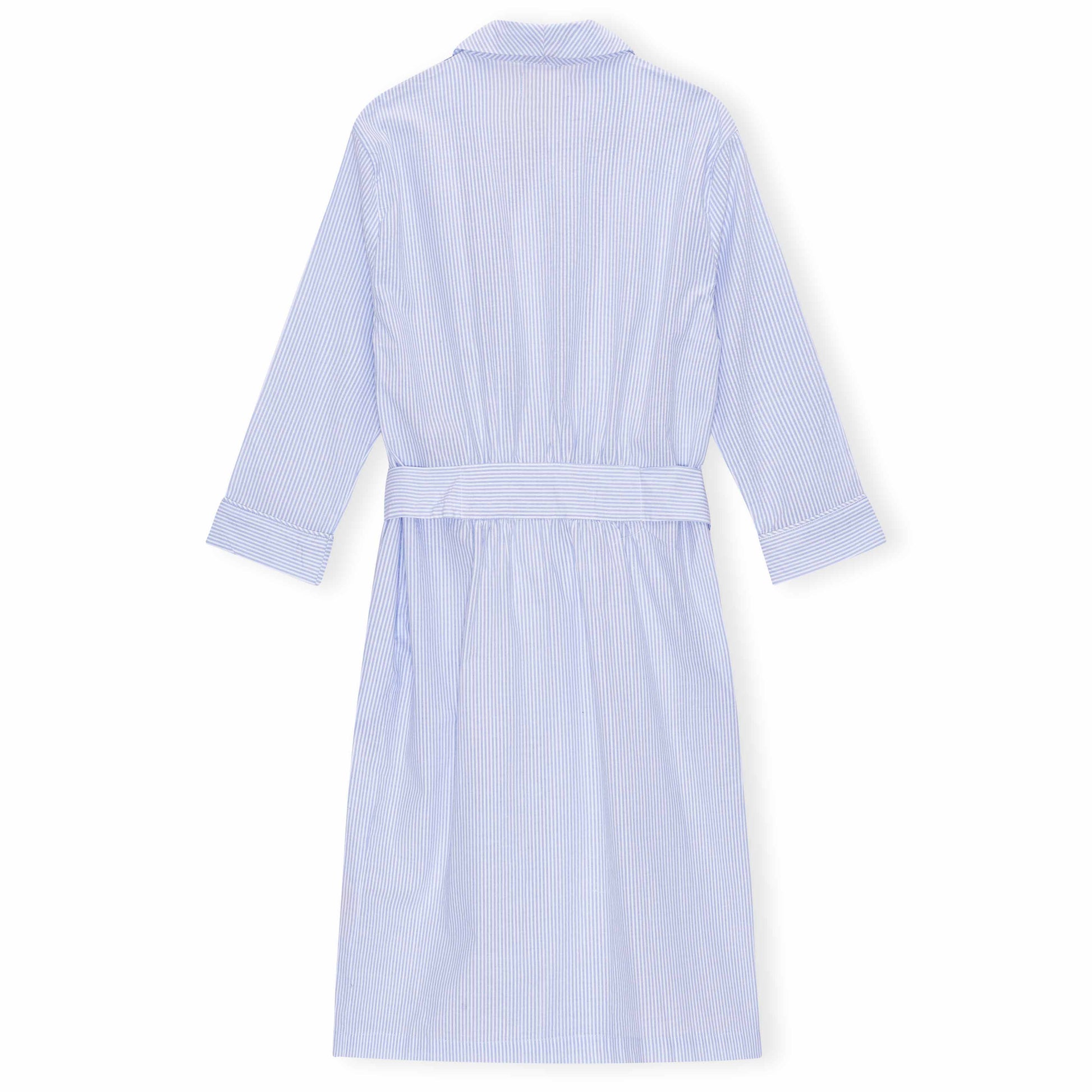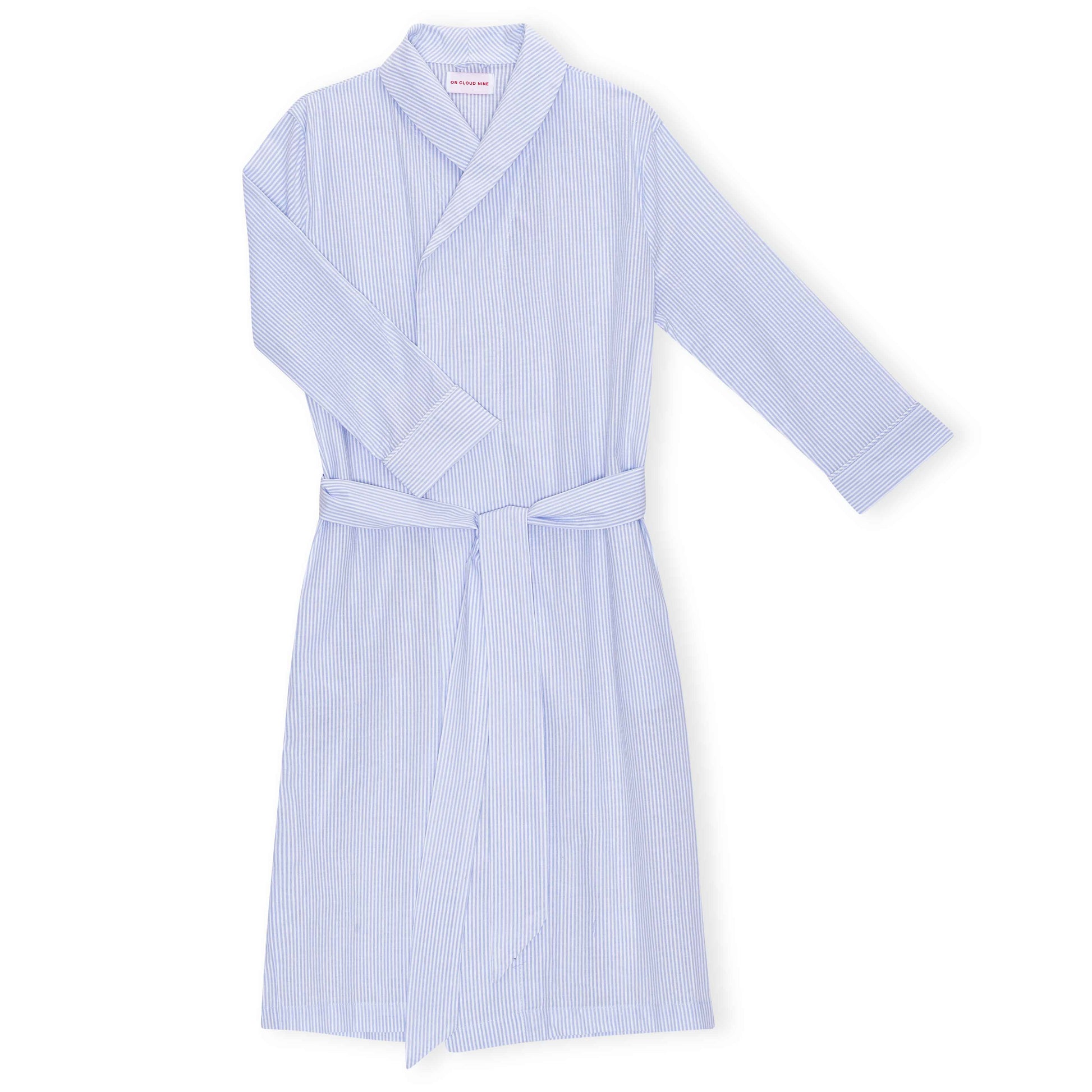 Soft and feminine light robe made in light cotton fabric with seersucker texture and classic light blue stripe.