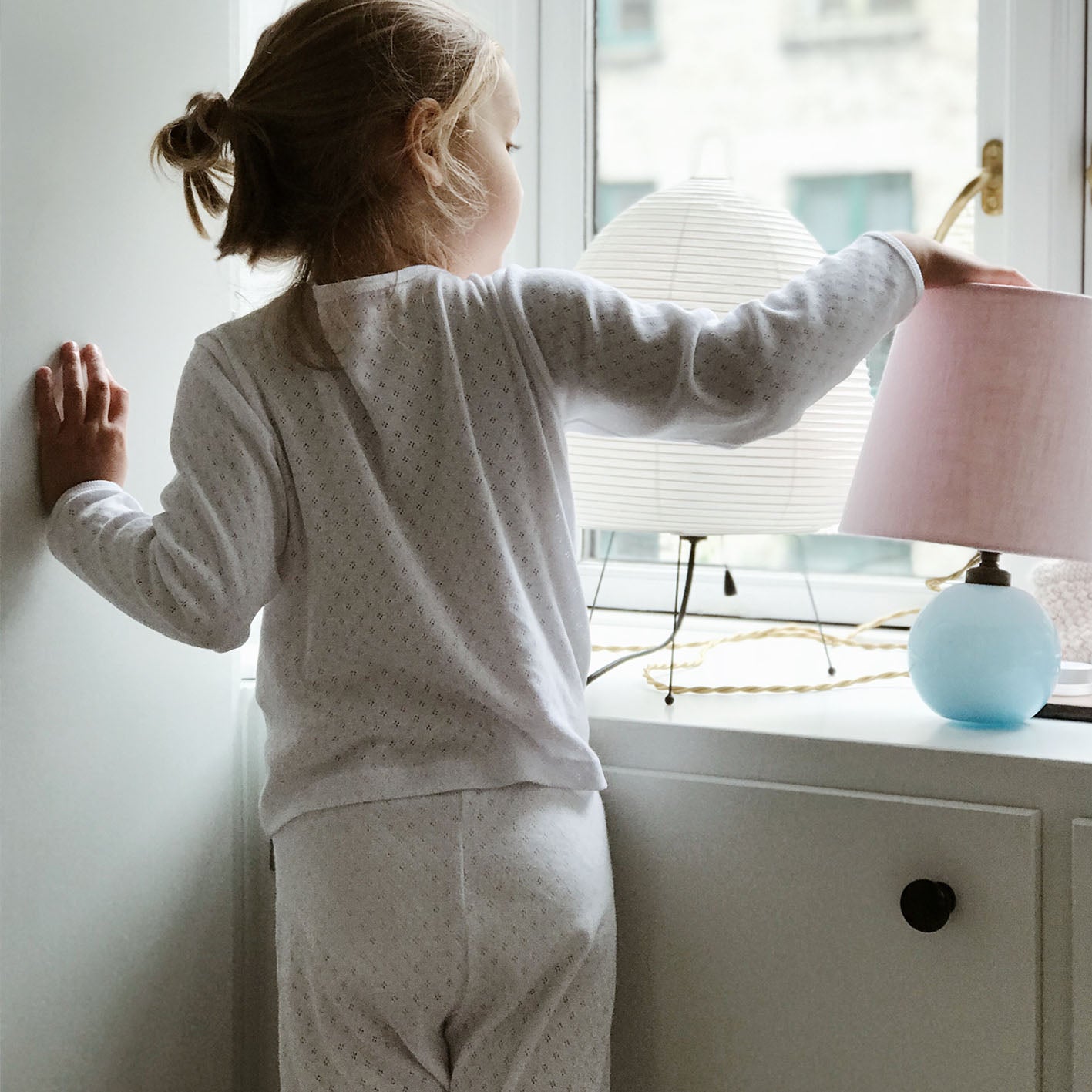 A beautiful set of white pyjamas in 100% soft organic cotton jersey with a refined pointelle pattern. Perfect for an airy feel while sleeping, playing or lounging.