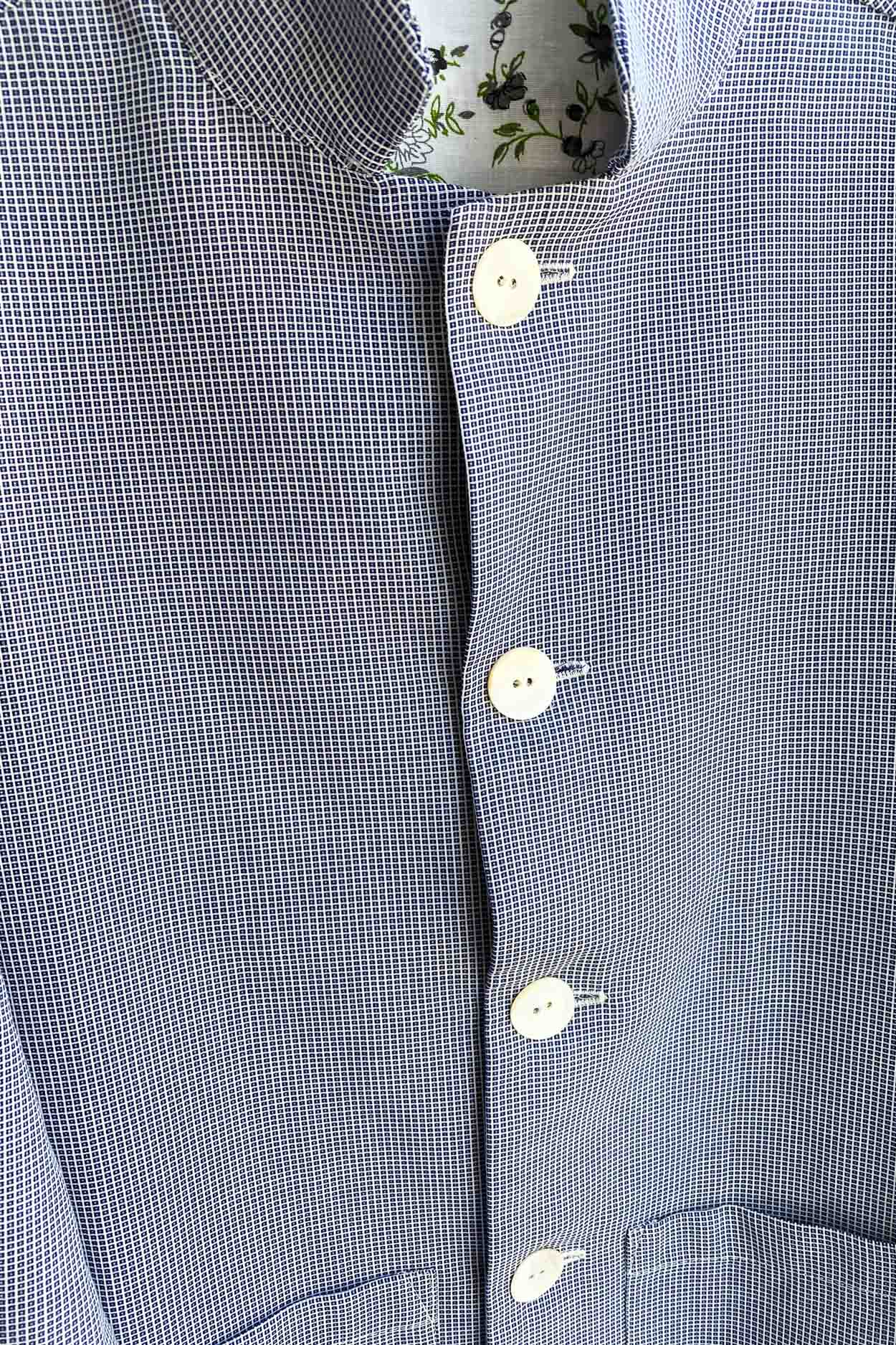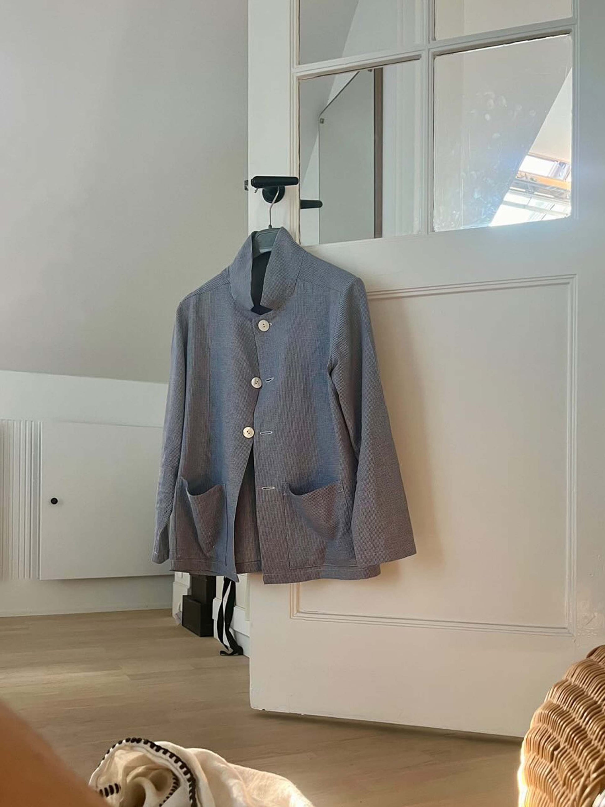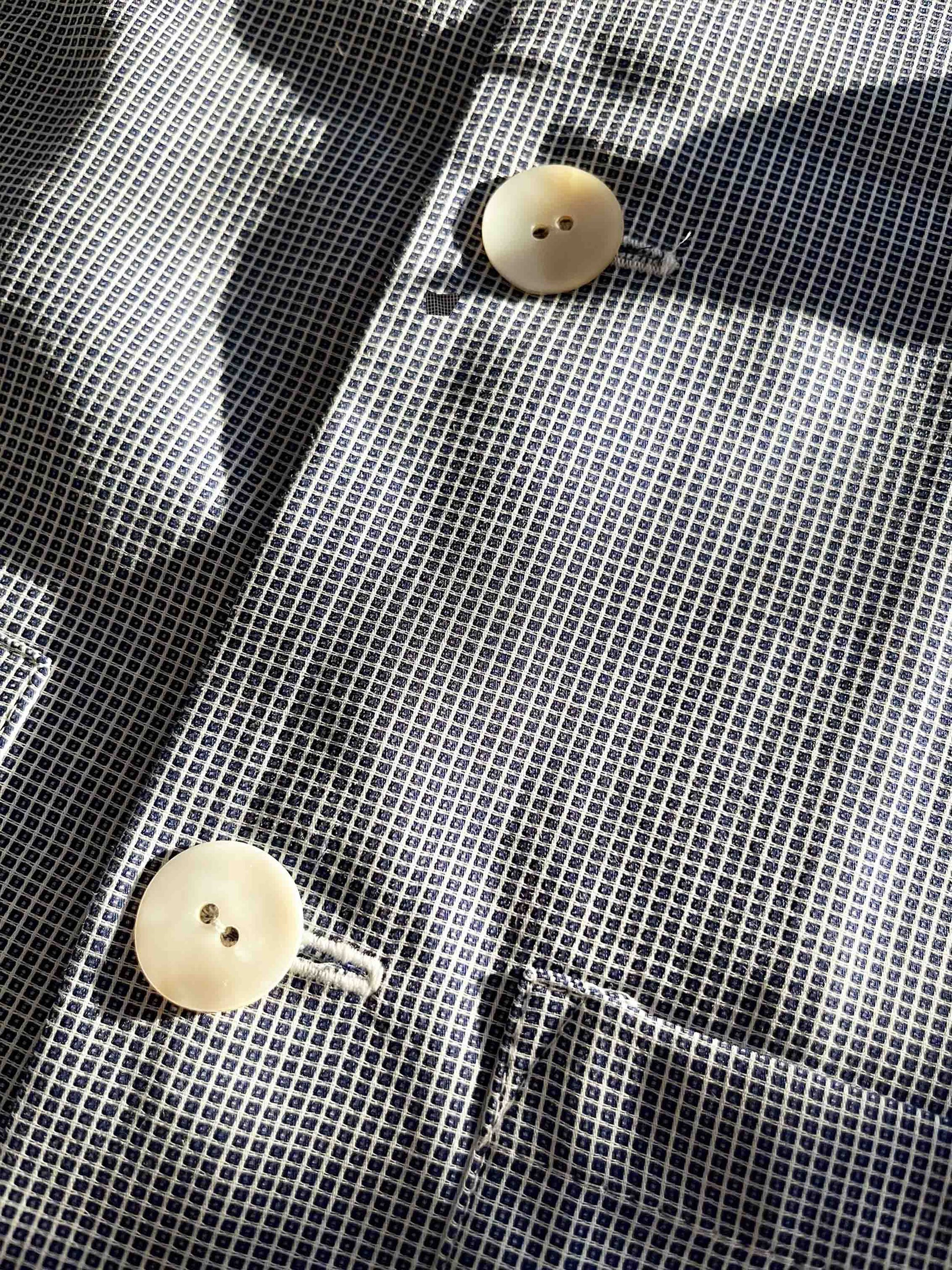 The jacket has a classic reverse, patch pocket and bigger mother of pearl buttons.