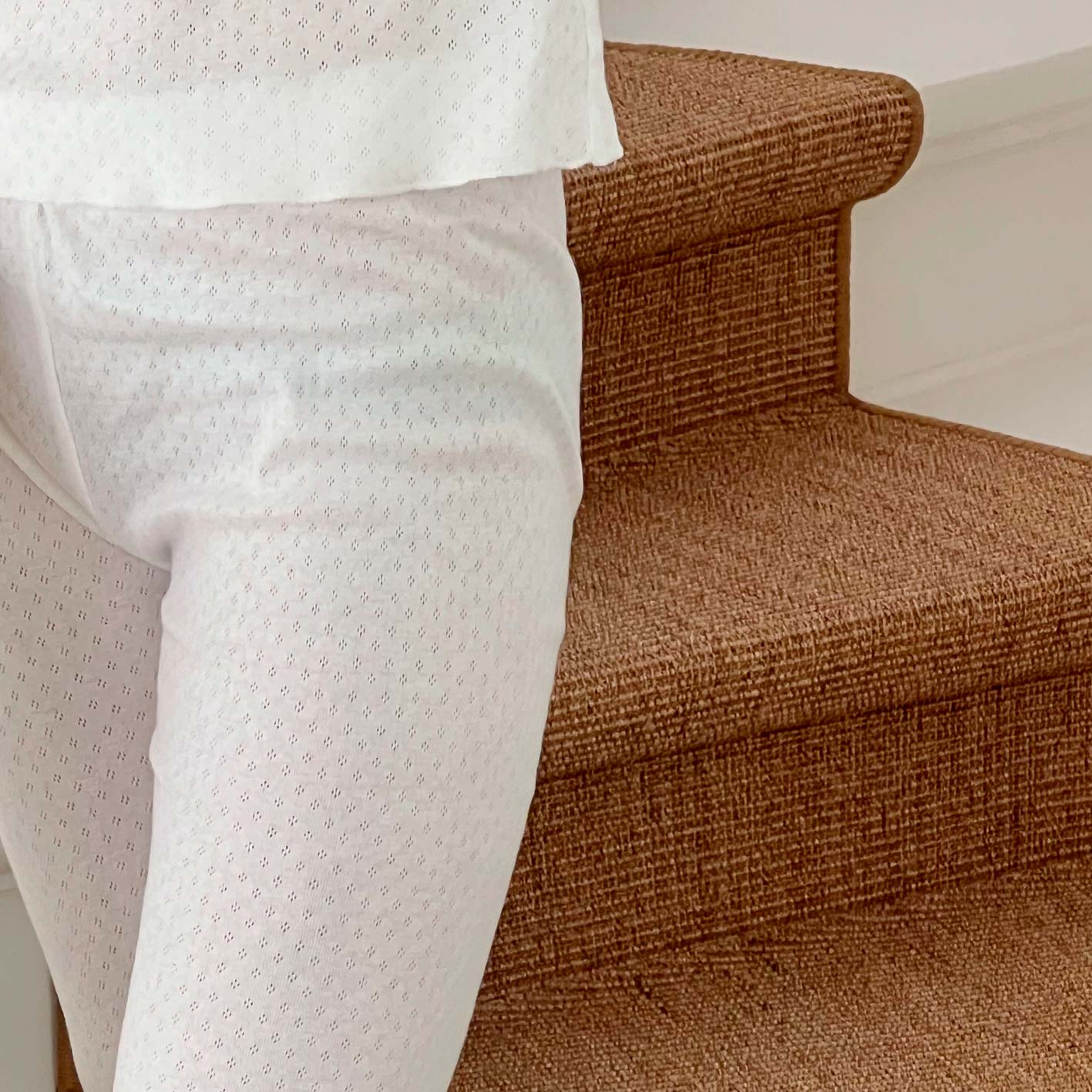 A soft pair of legging in a sophisticated clean optic white color. Fabric is 100% cotton jersey with a refined pointelle pattern. Perfect for an airy feel while sleeping, playing or lounging.