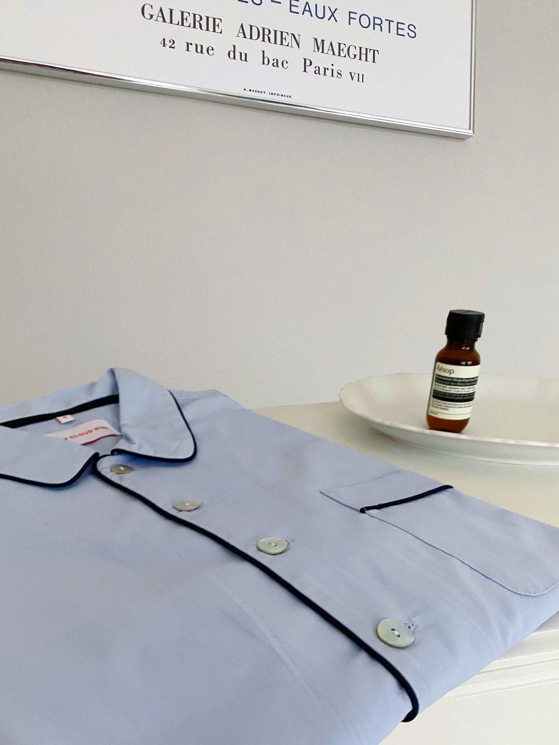 Fabric is crisp cotton poplin in delicate light blue. The fit is loose to ensure comfortable sleep and relaxation time. This set is perfect to lounge or sleep in.