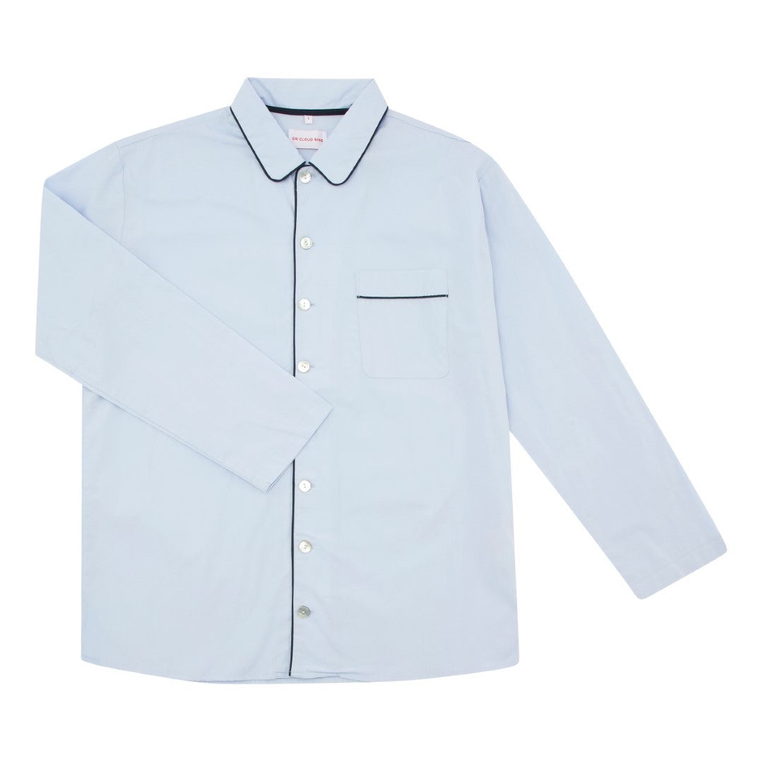 Classic pyjamas set button up. The pyjamas shirt comes with softly rounded corners finished with a contrast color dark blue piping detail, breast pocket and sophisticated mother of pearl buttons. Pyjamas pants with elastic waistband and piping cuff detail at leg end.