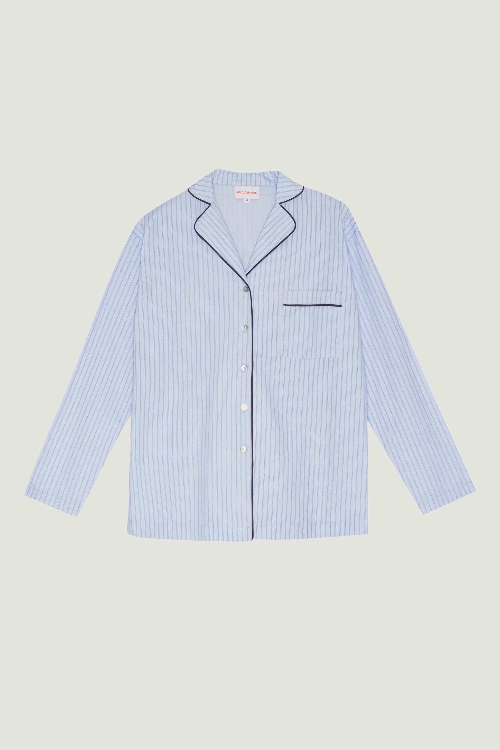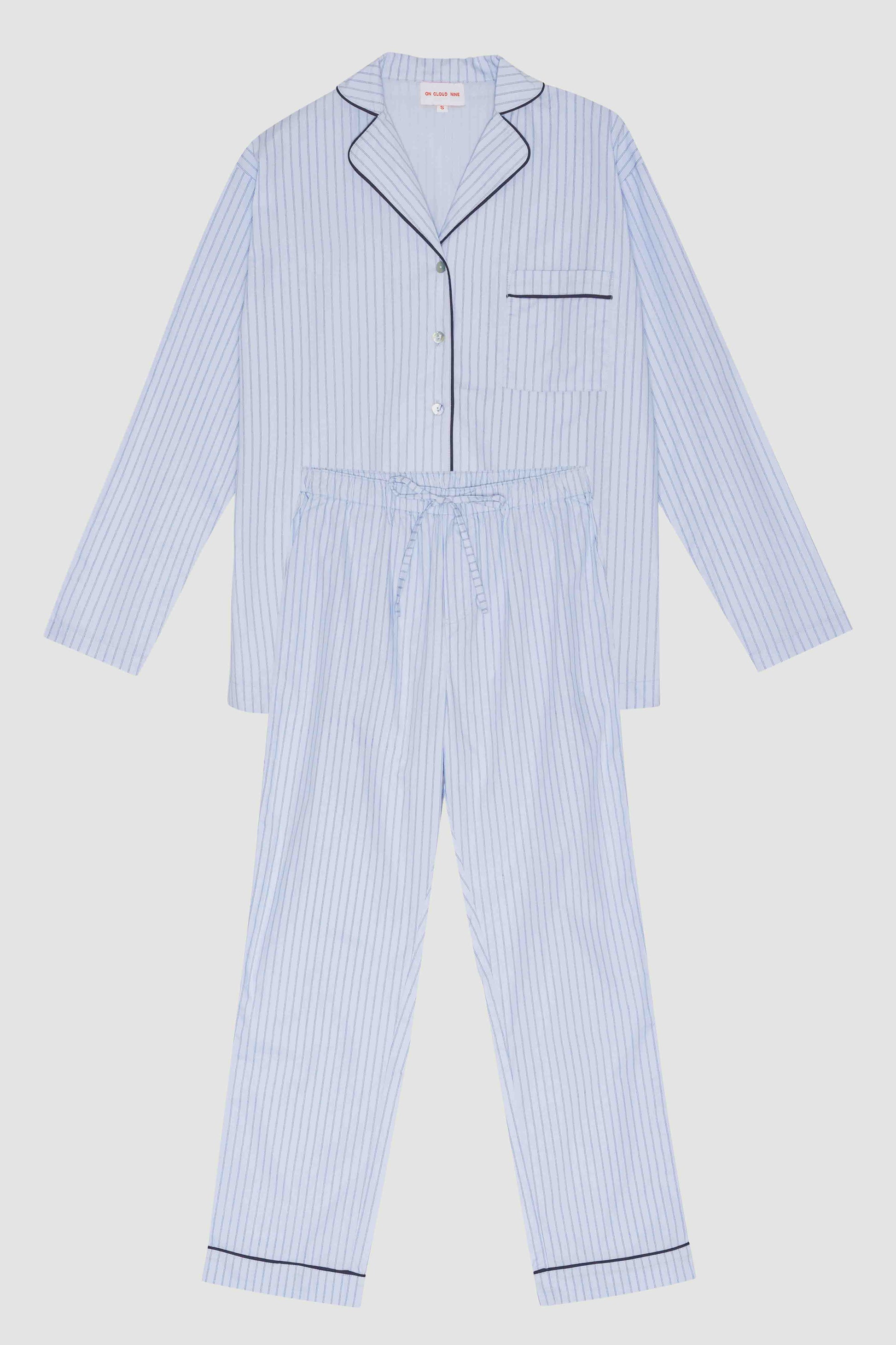 Classic pyjamas set for women with shirt and pants. Super soft and crisp exclusive cotton poplin in a classic light blue color with very narrow thin dark blue stripes and dark blue contrast piping.