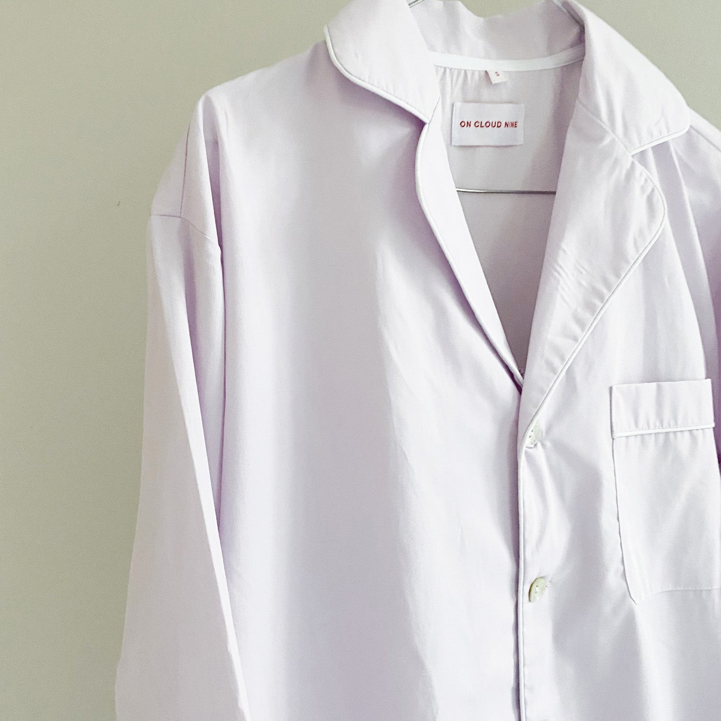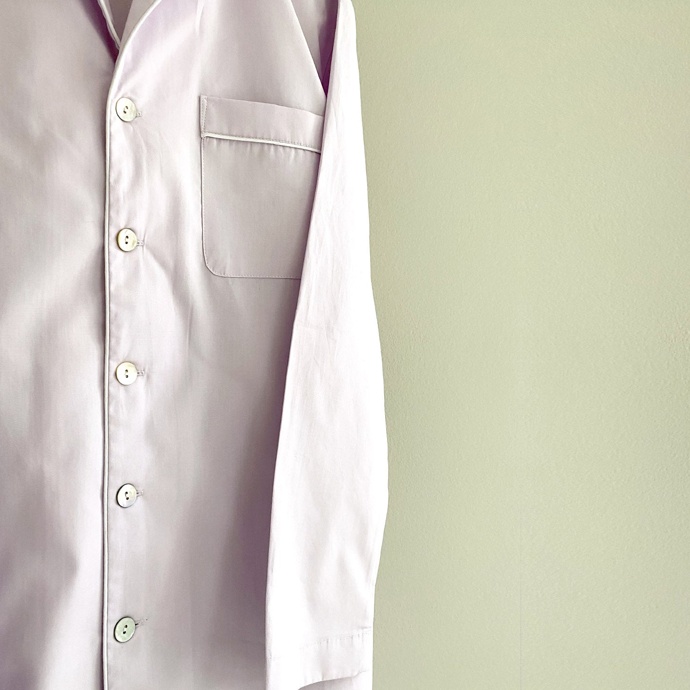 Classic pyjamas set for women with shirt and pants. Super soft and crisp exclusive cotton poplin in a soft and sophisticated light lavender color.